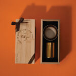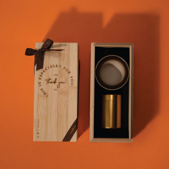 The San Ye Custom Tea Gift Set includes a small tea caddy paired with a ceramic gongfu tea cup.